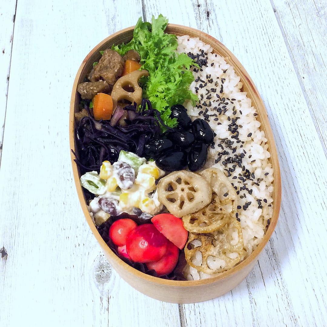 メニュー:筑前煮、紫キャベツ炒め、黒豆、コーンと豆のマヨサラダ、ラディッシュの酢漬けレンコンソテー、リーフレタス、ご飯