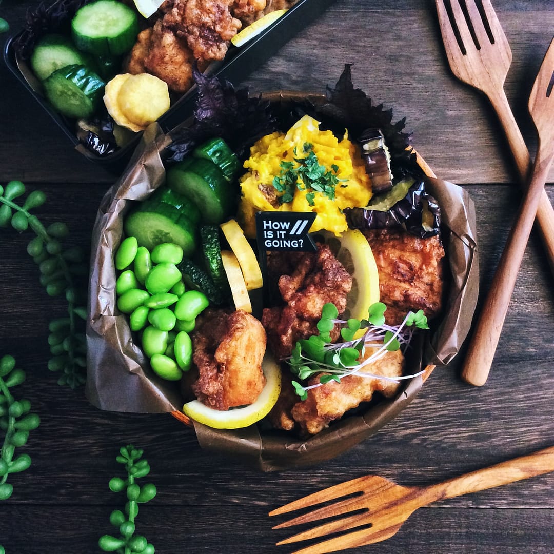 唐揚げ、かぼちゃサラダ、きゅうりの塩麹漬け、