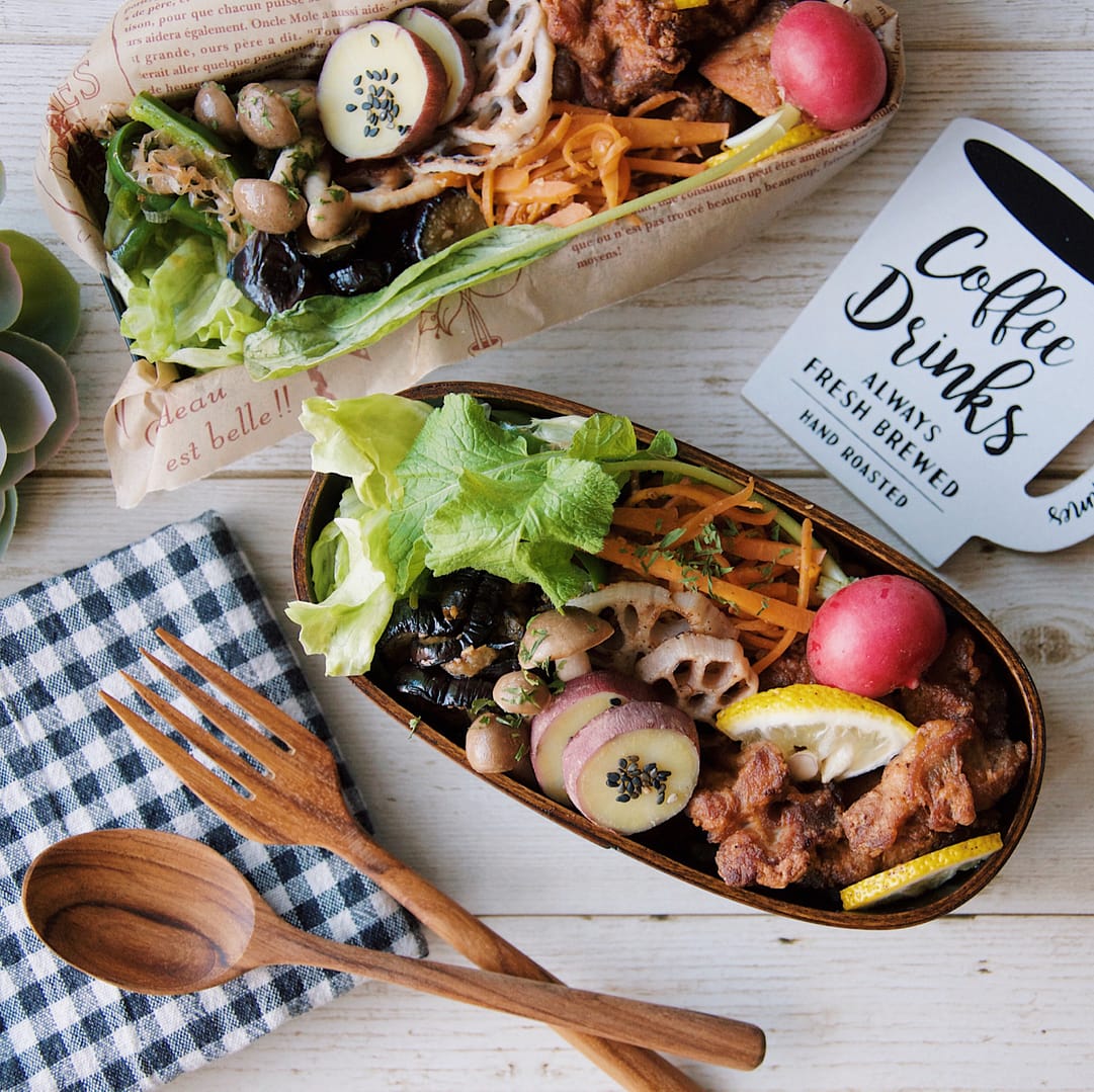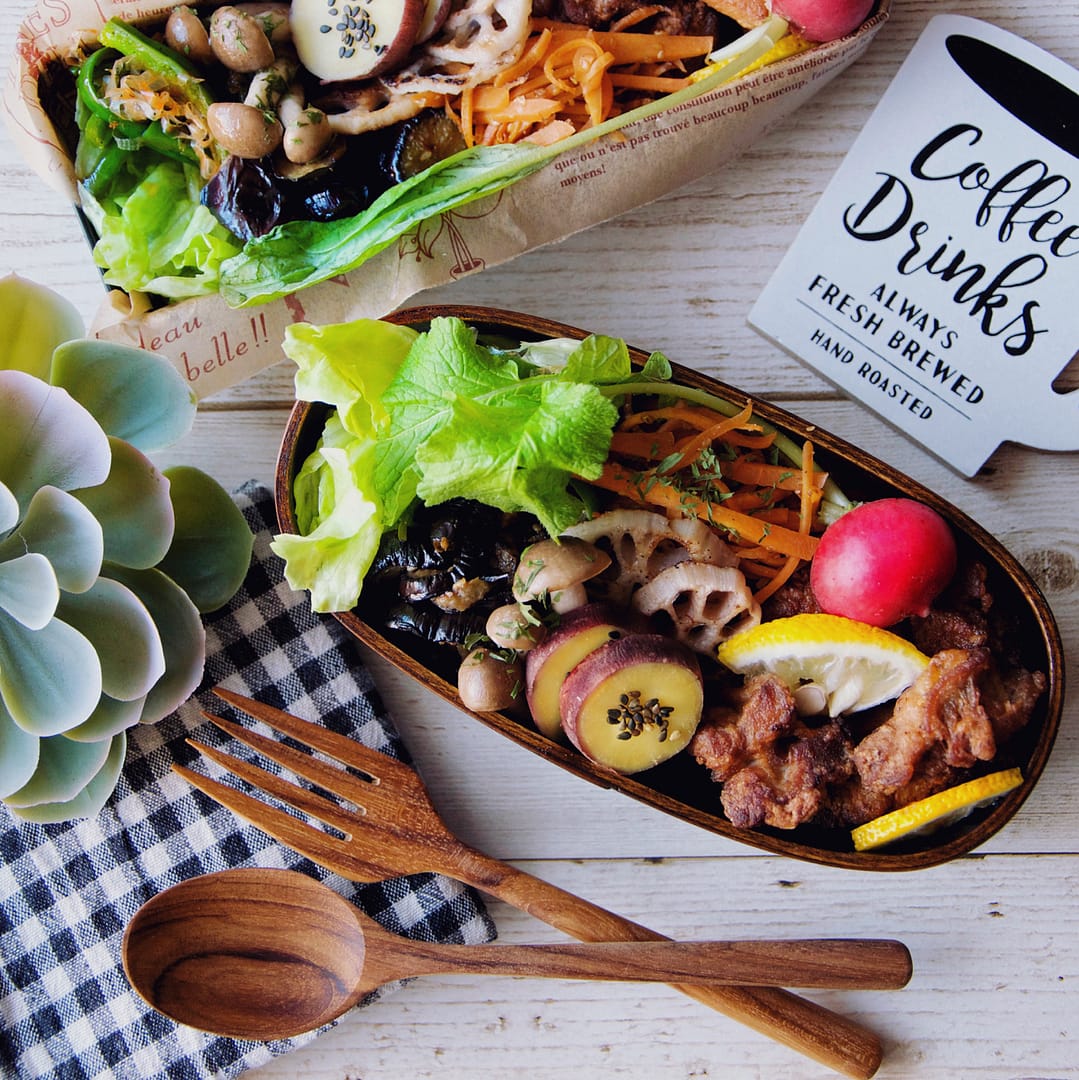 メニュー:鶏の唐揚げ、人参のソテー、れんこんソテーサツマイモ、シメジのソテー、ナスの生姜醤油あえ、丸ごとラディッシュ カテゴリー: LUNCHBOX-お弁当タグ: ご飯サツマイモランチ曲げわっぱ曲げわっぱ弁当